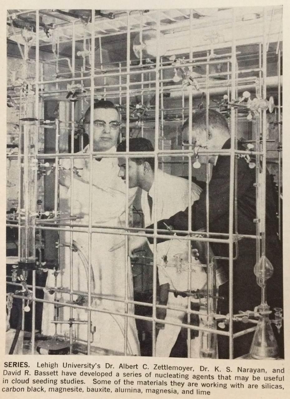 1964 was a busy year. This was also when the National Science Foundation (NSF) presented the work of a Dr. A.C. Zettlemoyer (1915-1991). Albert Zettlemoyer was an important figure in this development. Zettlemoyer discovered that small particles with both hydrophilic (water attracting) and hydrophobic (water resisting) sites were able to hold more water than uniformly hydrophilic particles. The NSF’s sixth annual weather modification report explains: