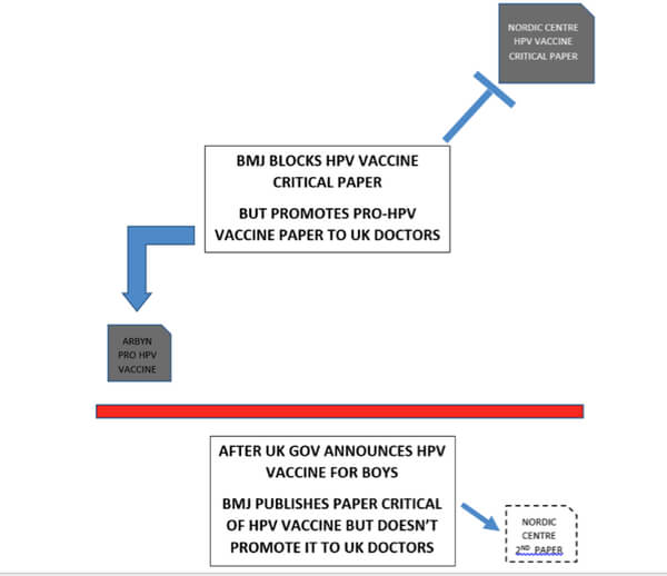 On May 9th of this year, after the rejection of the HPV-critical paper, Arbyn and colleagues, from another centre in the Cochrane Group, published a research paper on the HPV vaccine with one difference, it was pro-vaccine. The very day it was published, the BMJ did not attempt to block the information in the paper; in fact, it published a positive article on the paper in its main journal, ensuring that its members got to see that information and were left in no doubt that the HPV vaccine should be promoted to patients across the UK. The timing of the BMJ article (published the same day as the Arbyn paper was released) demonstrated that it was ready to go. This all happened just as calls for the HPV vaccine to be introduced for boys were building and increasing the pressure for the UK government to place it on to the schedule.