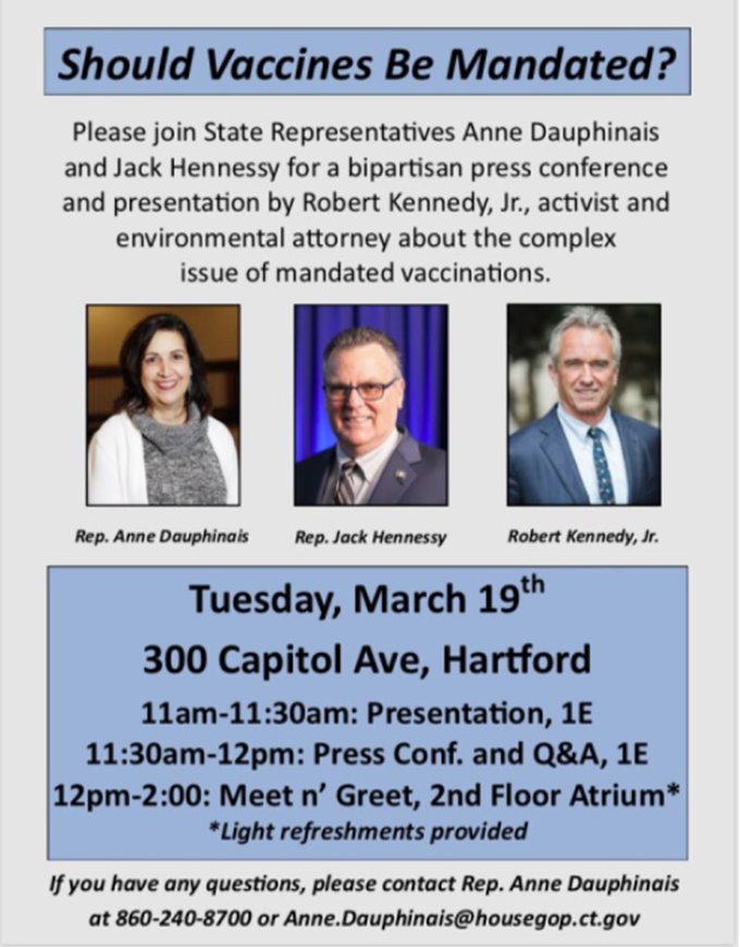 Robert F. Kennedy, Jr. appeared at a press conference and forum last week to debate the topic of vaccine mandates at the Connecticut state legislature. Speaking in a legislative meeting room and by audio to an overflow room—packed with hundreds of parents, vaccine safety advocates, the media, and CT state legislators—Mr. Kennedy educated the crowd on Pharma/government corruption that has led to the unprecedented epidemics now claiming the health of over half of our nation’s children.