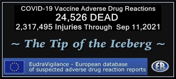 The EudraVigilance database reports that through September 11, 2021 there are 24,526 deaths and 2,317,495 injuries reported following injections of four experimental COVID-19 shots: