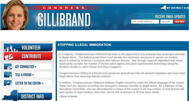 On her campaign page in 2008, New York’s virtual clone of Hillary Clinton, Kirsten Gillibrand, stated she is “a firm opponent of any proposal that would give amnesty to illegal aliens” and believed the “federal government must provide the necessary resources to secure our borders.”