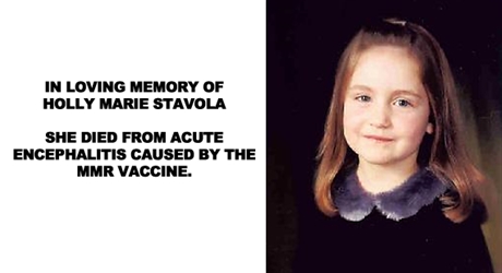 On February 4, 2000, Holly Stavola, a daughter and sibling, died tragically and unnecessarily from acute encephalopathy, due to her second MMR vaccination. The hospital and her pediatrician finally concluded this diagnosis.”