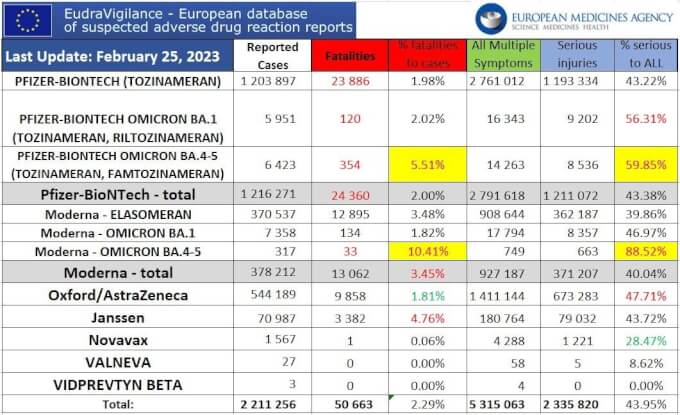 The European (EEA and non-EEA countries) database of suspected drug reaction reports is EudraVigilance, verified by the European Medicines Agency (EMA), and they are now reporting 50,663 fatalities, and 5,315,063 injuries following injections of EMA-authorized experimental COVID-19 shots as of February 25, 2023.