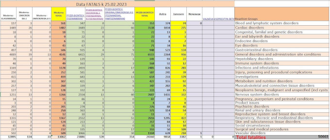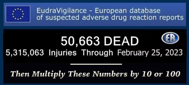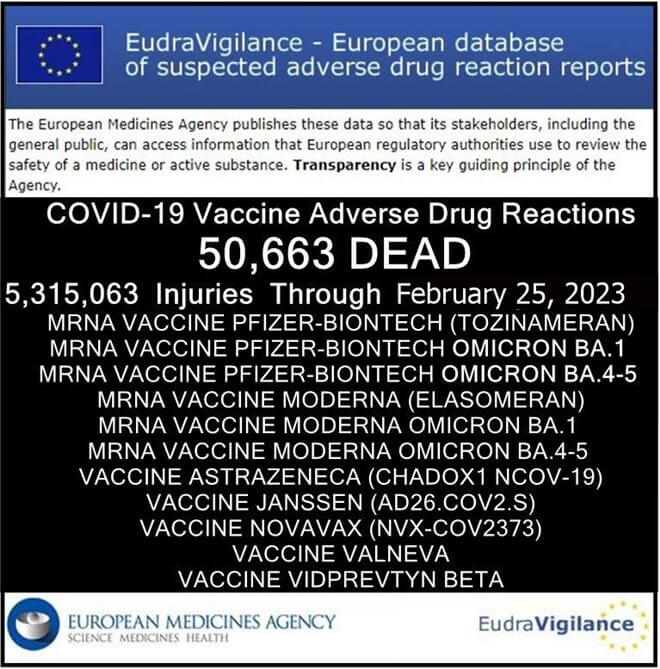 The European (EEA and non-EEA countries) database of suspected drug reaction reports is EudraVigilance, verified by the European Medicines Agency (EMA), and they are now reporting 50,663 fatalities, and 5,315,063 injuries following injections of EMA-authorized experimental COVID-19 shots as of February 25, 2023.