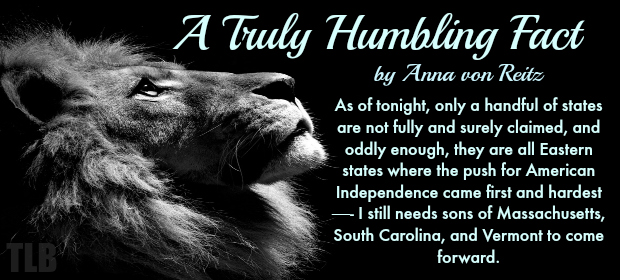 As of tonight, only a handful of states are not fully and surely claimed, and oddly enough, they are all Eastern states where the push for American Independence came first and hardest—- I still needs sons of Massachusetts, South Carolina, and Vermont to come forward.