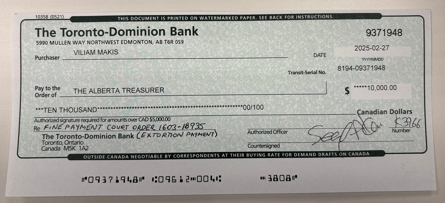 Mar.5, 2025: $10,000 extortion payment paid to Danielle Smith and AHS