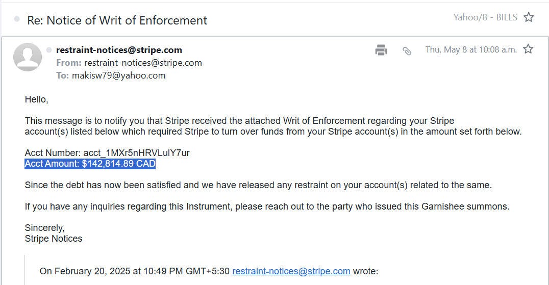 From February 2025 to May 2025, Danielle Smith’s team and her AHS and CPSA thugs debanked me via Stripe, froze my Stripe account and eventually stole $142,814 from it.