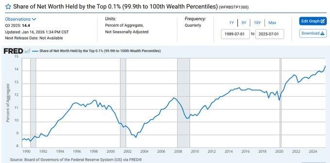 While financial and housing markets are simultaneously the most overvalued in world history, the average person trying to just live their life, raise a family, maintain a decent standard of living, and go on a modest annual vacation to the beach or mountains, is more financially stressed than they have ever been. The people who are not stressed are the 0.1% who rule the world (aka Epstein friends and family). They control over 14% of the country’s net worth, up from less than 9% in 2003. This has happened under the rule of both parties. The ruling class has engineered the financial system in way that siphons the riches to them, while steadily depleting the wealth of the masses.