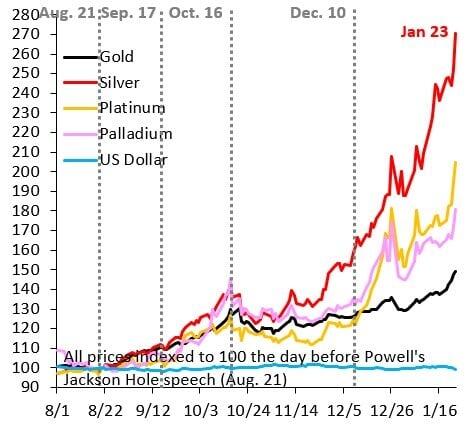 Charts become out of date pretty quickly when markets move as crazily as they have over the last month. Despite the USD only falling by about 1% since Powell’s August 21 speech confirming more rate cuts and the initiation of QE to infinity when markets were at record highs and the economy was supposedly booming, gold and silver took notice by soaring by 46% and 120% respectively. And this is after last week’s crash. When gold and silver act like meme stocks, all is not well beneath the surface of this economic system. Something is broken, on par with September 2019.