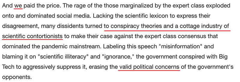Throughout this essay, he attempts to say we had ‘valid concerns’ (that I must emphasize were not political in nature) but nonetheless, in a backhanded way dismisses all the actual objections (e.g., the alleged ‘conspiracy theories’ that all proved themselves true).