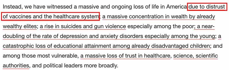 2. (And 3.) “Instead, we have witnessed a massive and ongoing loss of life in America due to distrust of vaccines and the healthcare system … a massive loss of trust in healthcare, science, scientific authorities, and political leaders more broadly.”