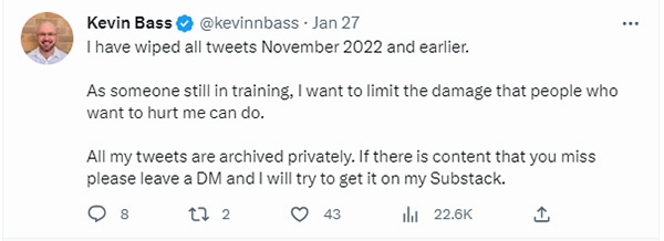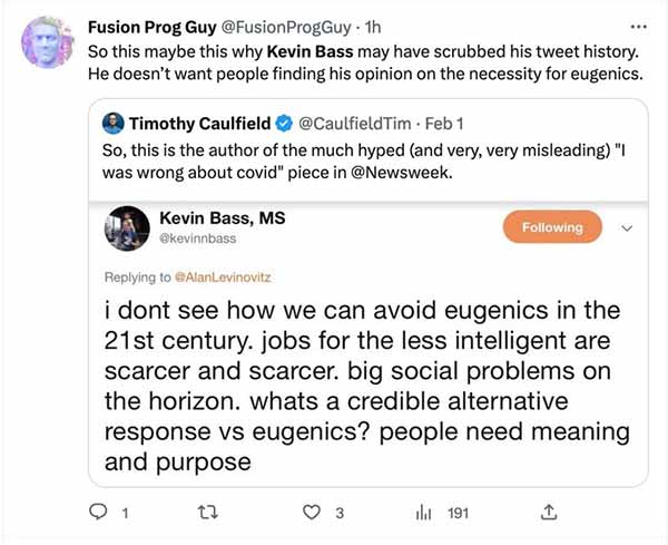 In the final analysis, then, Bass does little to rehabilitate public trust in the medical and scientific fields, or “authorities” in general, especially government authorities. His effort is a valiant one, and far more refined than Oster’s, but it still falls short. Bass simply isn’t believable and comes across as two-faced at best when you take into account his other communications, such as comments made on Twitter — and that’s after sanitizing his feed.