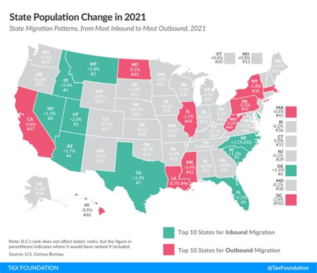 A new analysis from the right-leaning Tax Foundation reaches this conclusion. Analyst Jared Walczak broke down U.S. Census Bureau data and reports that while the United States overall saw only minor population growth in 2021, there were very significant shifts in state populations as people relocated.