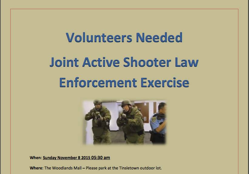 Evidently there is another active shooter drill going on in Montgomery County TX, and there is also a pdf with the details attached. It is planned for November 8, 2015 in TX. Are we at all shocked anymore, when we hear of a shooting and then learn that it was a ‘drill gone live’ afterward?