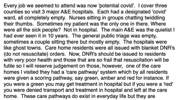 ER Editor: Another UK NHS whistleblower steps forward, this time a paramedic and member of the ambulance service. Simon Dolan, who republished this whistleblower’s account on Twitter yesterday and which we are republishing below, is the founder of Keep Britain Free (see Facebook, Twitter and CrowdJustice), a movement created in response to the illegal nature of the lockdown imposed on the UK citizenry (and pretty much all of us). See this by 21st Century Wire titled VIDEO: ‘Welcome to the New Normal’ – Keep Society Free. He is fighting to bring legal action against the UK government.