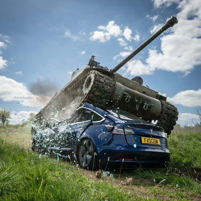 Anti-Musk Activists Crush Tesla With Tank