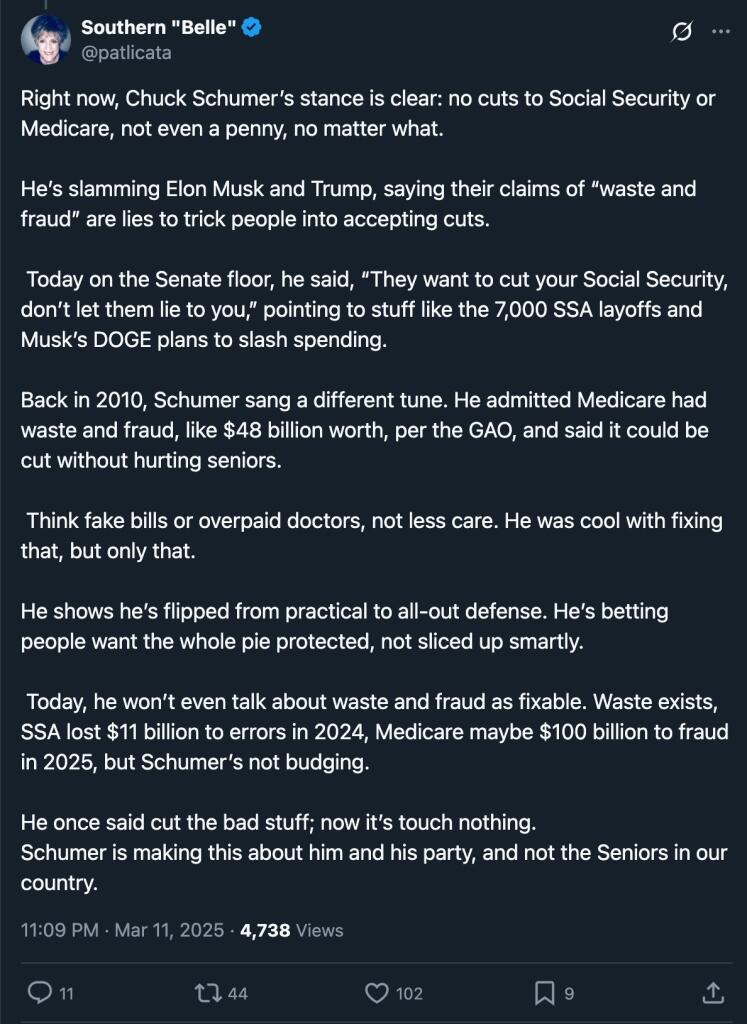 Chuck Schumer just posted that Elon is a liar for claiming that Social Security and Medicare have lots of waste, fraud, and abuse.