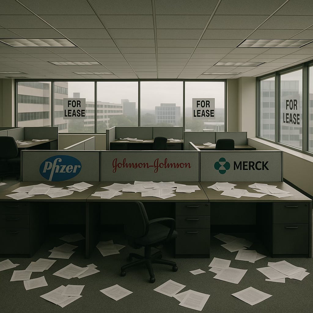 These mass layoffs underscore a broader decline in Big Pharma’s fortunes. After years of sky-high profits, the industry’s market dominance is shrinking. Companies are retrenching to survive a perfect storm: post-pandemic demand slumps, fewer new blockbusters, and the Inflation Reduction Act’s upcoming drug price controls. Even the stock market’s confidence in pharma has wavered; Pfizer and Moderna, once market darlings for their COVID vaccines, have seen their valuations slide as sales dry up. The result is a sector “navigating workforce reductions amid industry-wide cost-cutting” and bracing for leaner times⁵. In short, Big Pharma’s long-held growth narrative is cracking — and the cracks are widening by the day.