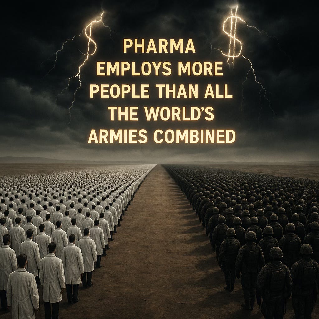 Entire industries, payrolls, and even national GDP figures depend on the continuation of chronic disease. Pharma’s payroll is, in effect, an army — one mobilized not for defense, but for sustaining a business model of lifelong patients.