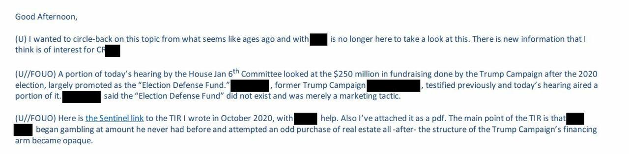 In June 2022, the FBI re-assessed the financial investigation (or at least had renewed interest in the financial investigation), citing to the House January 6th Committee’s “investigation” into the Trump Campaign’s post-2020 election fundraising, which was promoted as the “Election Defense Fund.” See the FBI email below.