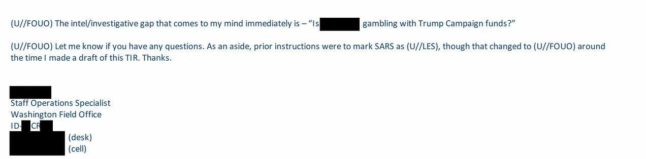 This campaign finance investigation – which was opened by the FBI’s New York Field Office – stemmed from an AMMC member’s potential gambling activities, his efforts to allegedly evade federal $10,000 reporting requirements when cashing-in his winnings, and the alleged pay-off of a Senegalese government official. The FBI’s thought was that the party (the gambler) potentially used Trump campaign funds distributed through AMMC “for personal or unauthorized use.” It should be noted that the FBI’s October 2020 “Tactical Intelligence Report” made its assessment with “low confidence.”