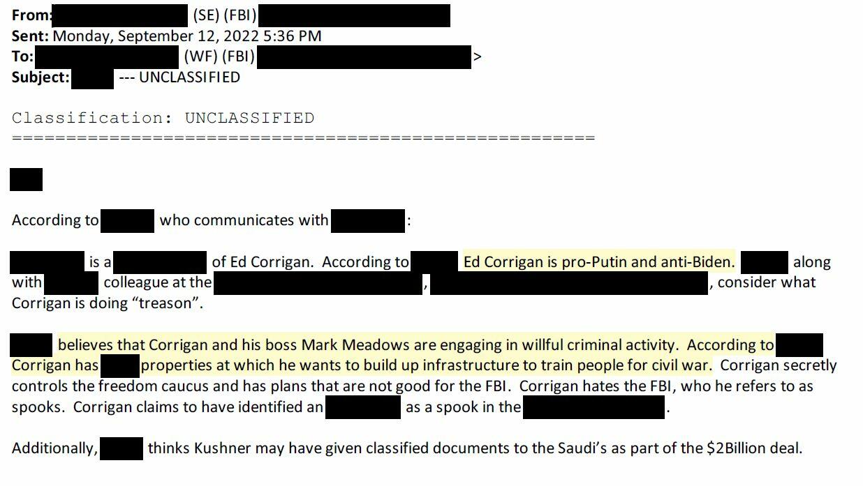 It’s not like the FBI is immune to advancing conspiracy theories. The agency never learned its lesson from Crossfire Hurricane. In September 2022, there was this email from an agent with the Seattle Field Office that relayed “intelligence” from one of their sources regarding Ed Corrigan (bio here), the President and CEO of Conservative Partnership Institute. Corrigan is as harmless as they come – and here we have internal FBI documents discussing him being “pro-Putin and anti-Biden”, that he is engaged with Mark Meadows “in willful criminal activity”, that Corrigan has “properties at which he wants to build up infrastructure to train people for civil war”, and that Corrigan “has plans that are not good for the FBI.”