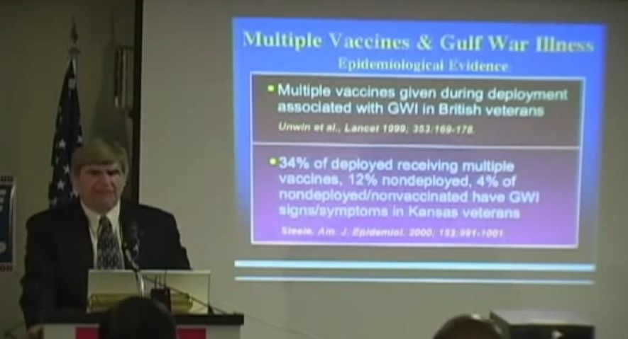 Dr. Nicolson told his audience that the number one source of Gulf War illnesses were the microbes that military personnel received as contaminates in the vaccines they were given prior to being deployed to the Persian Gulf. Most military personnel received 20 to 30 vaccines during a 2 to 3 day period prior to being deployed for the first Gulf War. He explained, “It was very wrong to do this. It is very immunosuppressive to give all those vaccinations in a short period of time. It makes people very susceptible to super infections or to being infected by a contaminant in the vaccine.”