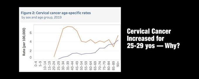 Since 2007, all girls and women up to age 26 have been offered the HPV vaccine in Australia. Government numbers show a 16% cancer increase in 25-year-olds, a 28% increase in 30-year-olds, several years post vaccination. The 30-year-old’s rate increased from 5.4/100k to 6.9/100k. The 25- year-old’s rate rose from 3.2 to 3.7 per 100k.