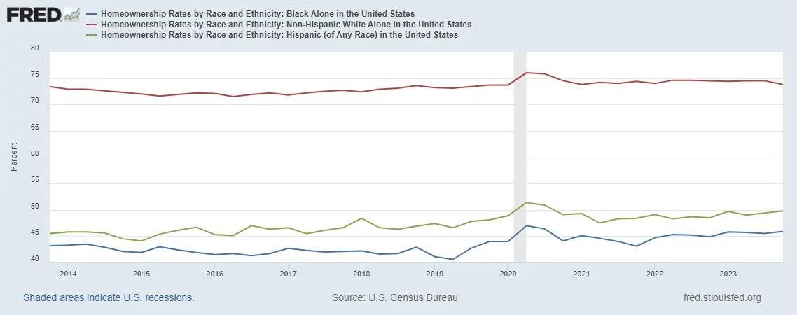 Between January 2021, when President Biden took his oath of office, up to March of this year, average rents have increased by 20 percent. By comparison, residential rents increased just 12 percent during President Trump’s entire term. The increased costs hit blacks and Hispanics disproportionately because of the vast disparity in home ownership, as illustrated below.