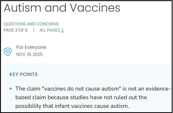 The webpage previously stated there is no link between vaccines and autism. It now says, “The claim ‘vaccines do not cause autism’ is not an evidence-based claim because studies have not ruled out the possibility that infant vaccines cause autism.”