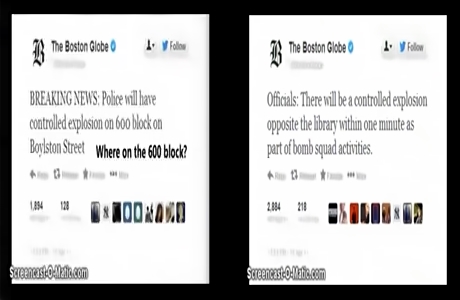 This is a preliminary inquiry, where I would be glad to provide additional proof, but where I have recently done a video update of the evidence in the case, including police on bullhorns announcing, “This is a drill! This is a drill!”, tweets from the Boston Globe explaining that a demonstration bomb will be set of as part of bomb squad activities and a second announcing one will be set off in one minute in front of the library (where it goes of as predicted), an absence of blood which only shows up on a delayed basis (and is not real blood but Hollywood blood) and much more.