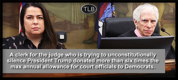 A clerk for the judge who is trying to unconstitutionally silence President Trump donated more than six times the max annual allowance for court officials to Democrats. Witch hunt! https://t.co/h9sohPx4MT