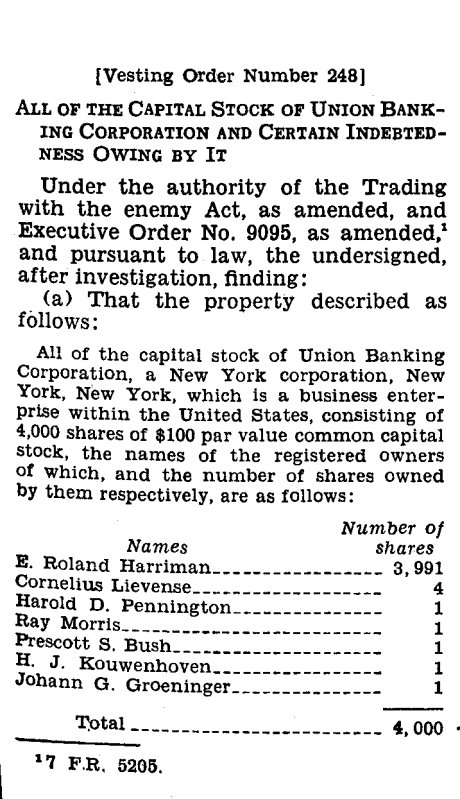 UBC and related Harriman-Bush Nazi interests were seized and shut down by the World War II Roosevelt Administration in 1942. By this time, the Bush family fortune had been made, and genocide was accelerating.