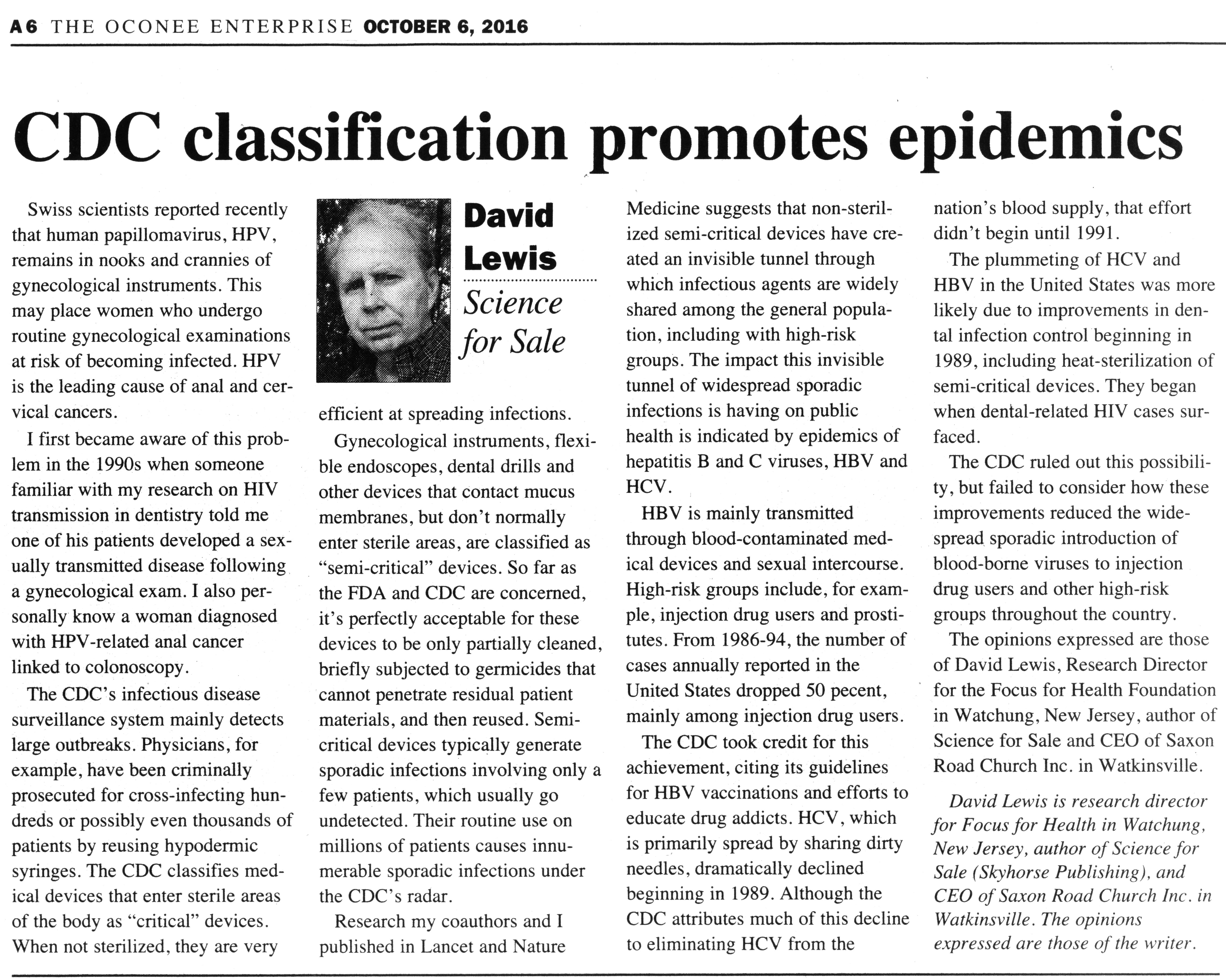 Gynecological instruments, flexible endoscopes, dental drills and other devices that contact mucus membranes, but don’t normally enter sterile areas, are classified as “semi-critical” devices. So far as the FDA and CDC are concerned, it’s perfectly acceptable for these devices to be only partially cleaned, briefly subjected to germicides that cannot penetrate residual patient materials, and then reused. Semi-critical devices typically generate sporadic infections involving only a few patients, which usually go undetected. Their routine use on millions of patients causes innumerable sporadic infections under the CDC’s radar.
