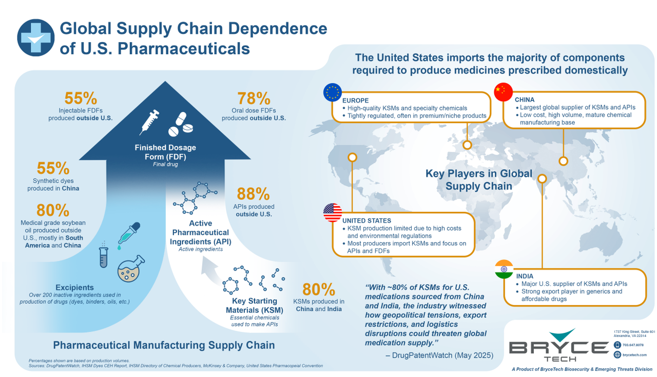 To visualize the U.S.’ heavily dependent medical supply chain on overseas trading partners, research firm BryceTech released an in-depth graphic on Tuesday, highlighting the industry’s deep overseas dependencies. The graphic suggests that significant domestic investment will be required—echoing UBS’s view that a 12- to 18-month grace period is insufficient to reshore production at scale.