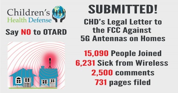 Children’s Health Defense (CHD) submitted an Ex-Parte letter to the FCC against the OTARD rule expansion which aims to allow 5G cell towers on homes. Following CHD’s successful campaign to bring awareness to the FCC intentions, the letter was signed by 15,090 people. At 735 pages, in terms of signatories, it is likely one of the largest submissions to the FCC. Each signatory was verified in advance of the submission to ensure the FCC would not be able to attack the integrity of the signatories as was the case with the Net Neutrality submission.