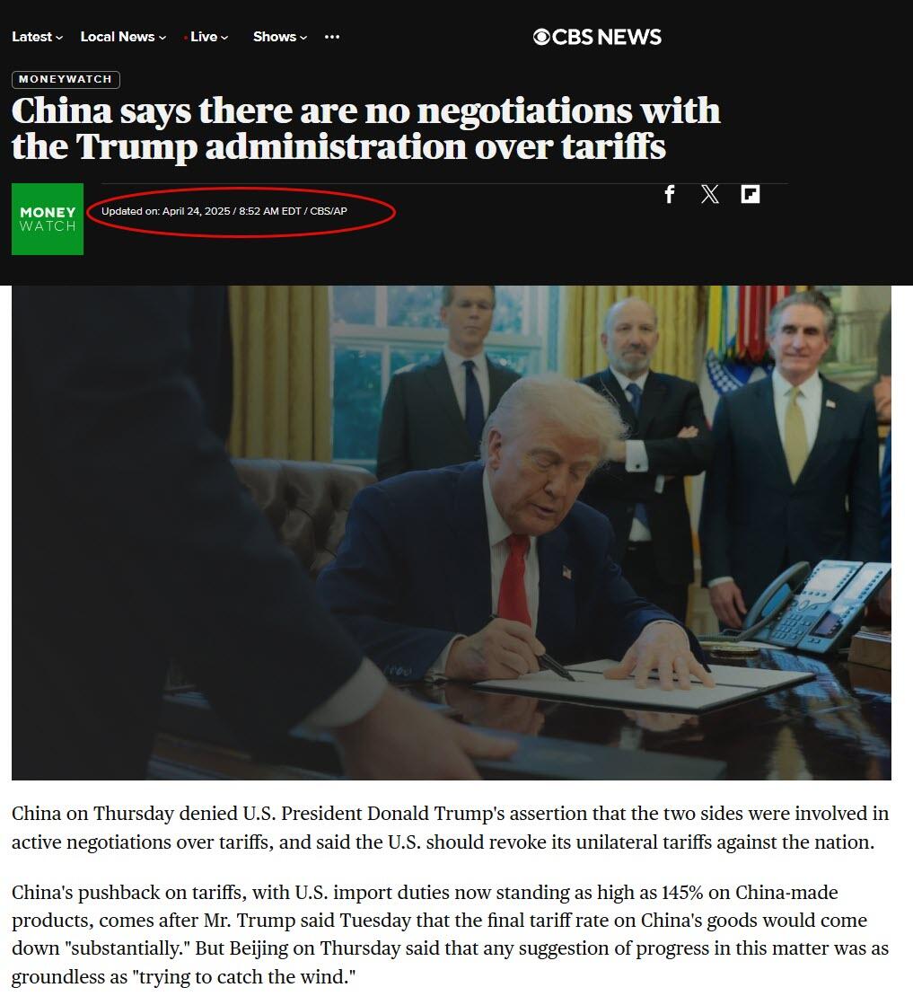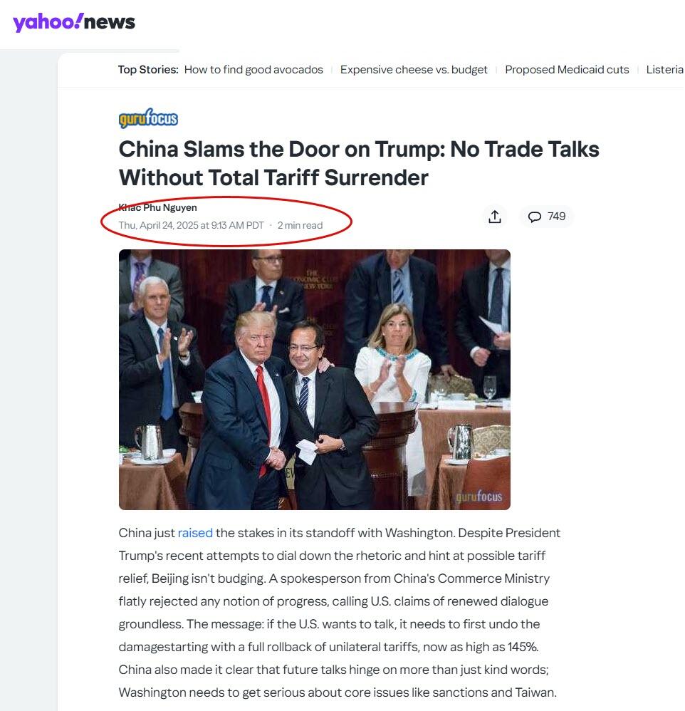 The date April 24 is interesting for another reason: that’s the day Chinese state media vowed that it would not engage in trade talks without complete tariff surrender, with Yahoo News reporting that “China Slams the Door on Trump: No Trade Talks Without Total Tariff Surrender.”