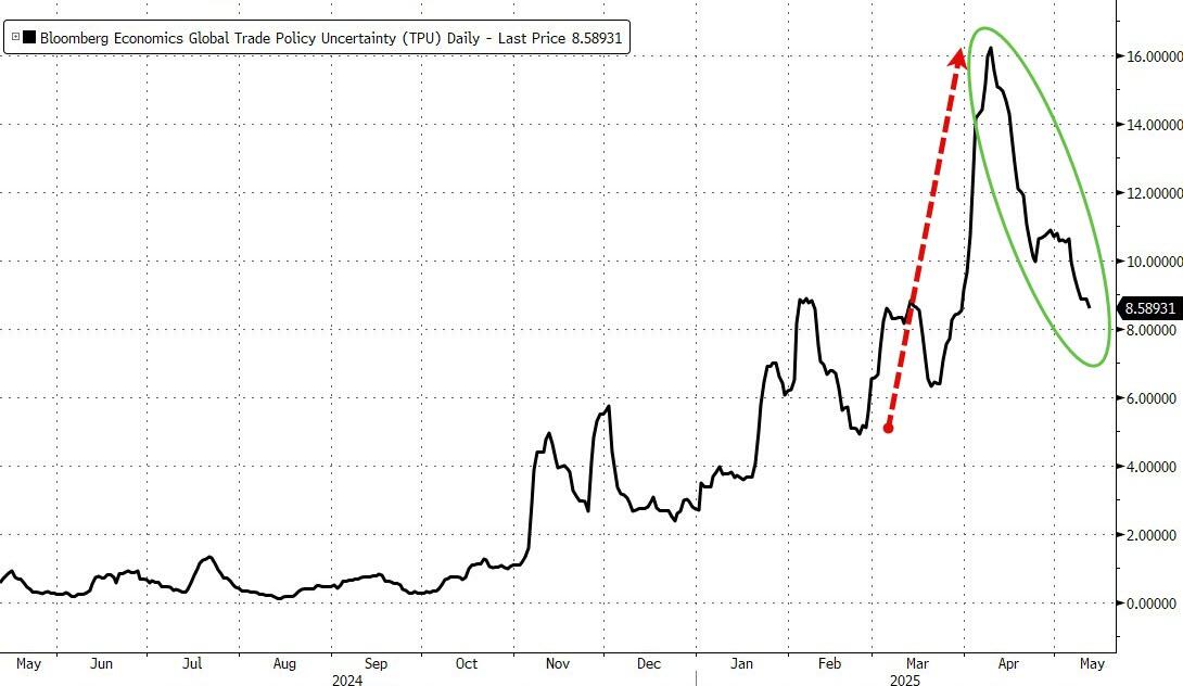 The reflexive nature of global market pain leading to geopolitical negotiations appears to have won out once again as “Uncertainty” around US trade policy has plunged …