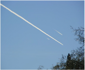 Fig. 7. Three aircraft flying simultaneously in the same physical environment in which contrail formation is possible in the air above Tucson, Arizona (USA) in 2011. Note that two display short contrails characteristic of rapid ice evaporation. The lengthy trail across the sky is not a contrail – otherwise it would have evaporated as quickly, and been as short, as the other two. Rather, the long trail is formed by emplaced particulate matter. Courtesy of Bornfree and Russ Tanner [from Dr Herndon’s paper]