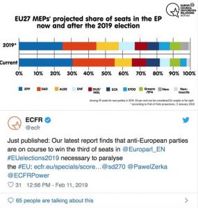 The European Council on Foreign Relations (ECFR) report describes the vote as “the most consequential parliamentary vote in the EU’s history” and says it is even possible for Euroskeptic parties to gain more than 30 percent of the EP’s seats “if their popularity continues to grow or if some of the fringe members of the mainstream join them.”