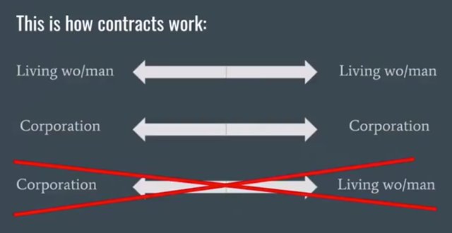 See the visual below of who can contract with whom. Living people (man / woman) CANNOT CONTRACT with Corporations. Living men and women can only contract with each other, and corporations can only contract between themselves.