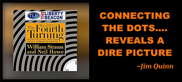 Day to day vestiges of modern civilization – bank machines, mutual funds, mass retailers, computers, satellites, airplanes, governments – all recede into irrelevance. Picture yourself and your loved ones in the midst of a howling blizzard that lasts several years. Think about what you would need, who could help you, and why your fate might matter to anybody other than yourself. That is how to plan for a saecular winter. Don’t think you can escape the Fourth Turning. History warns that a Crisis will reshape the basic social and economic environment that you now take for granted.” – Strauss & Howe – The Fourth Turning
