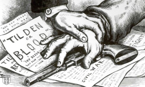 “Tilden or Blood!” was a slogan at the time and Democratic candidate Samuel Tilden’s supporters declared that they had 100,000 men ready to march on the capital and install him as president if need be. A party-line vote of the Electoral Commission gave all the votes to Republican Rutherford B. Hayes, making him president. However, as a concession, the South got the end of Reconstruction and the withdrawal of all remaining federal troops.