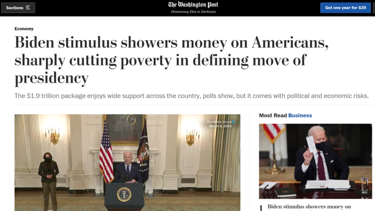 The Washington Post has been mocked for an overly enthusiastic headline that called the coronavirus relief bill a “defining move” of Joe Biden’s presidency, poised to “sharply” cut poverty by “showering money” on Americans.