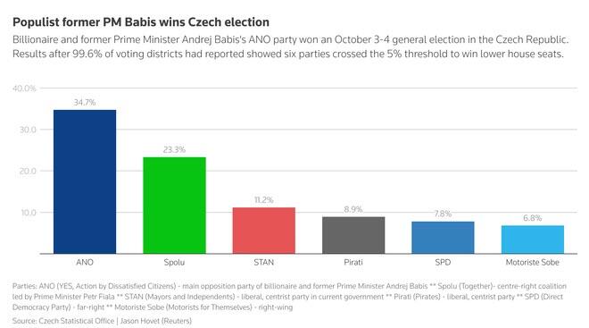 The ANO (YES) movement, led by Andrej Babis, has won about 35% of the parliamentary vote