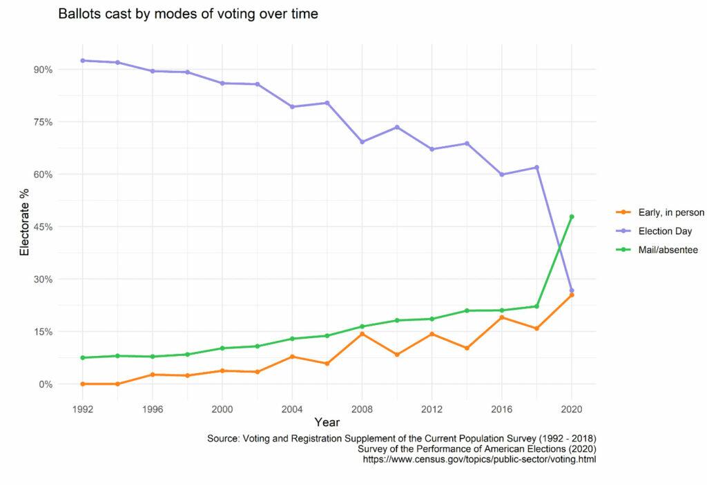When the Supreme Court denied the State of Texas’s lawsuit in December of 2020 to challenge the integrity of that year’s general election for lack of Article III standing, there already existed an overwhelming trove of evidence of procedural abnormalities and statistical anomalies that pointed to fundamental questions about the legitimacy of the election. Well over 155 million votes were allegedly cast in that year’s cycle – the most of any vote total in presidential history, surpassing 2016’s previous record-setting high by a whopping 28 million votes. Moreover, the 2020 election not only saw the highest percentage of votes cast either by mail or absentee ballot in modern American history, but it was the first time in which election day voting represented a minority of all methods of casting ballots: fewer than one third of voters who cast their ballots in the 2020 general election did so in person on election day.