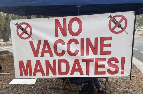 Employees from the Jet Propulsion Laboratory (JPL), a NASA field center, hang a sign in protest of the federal COVID-19 vaccine mandate in Pasadena, Calif., on Nov. 1, 2021. (Alice Sun/The Epoch Times)