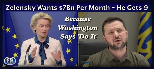 ER Editor: Washington’s poodles strike again. This sounds like a shovelling of money into oligarchal pockets at the Ukrainian (and/or European) taxpayers’ expense. According to this report, around 3.2 billion euros have already been given, to be followed by another 9 billion for immediate, short-term financing. Zelensky claims to need 7 billion a month. There will be surely much more to follow.