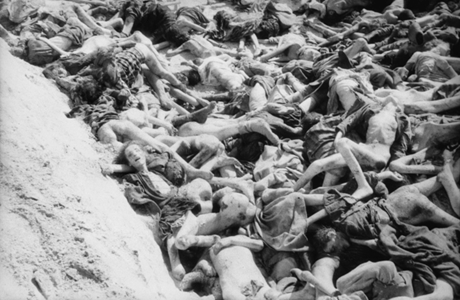 A broken and twisted mound of emaciated corpses lay strewn in one of three open burial pits at the liberation of Belsen on 15 April 1945. British troops were faced with over 10 000 dead inmates who required immediate burial to halt the spread of typhus and other diseases. Belsen, one of many Nazi concentration camps of the German Third Reich, was used as an instrument of genocide against Jews and those of other nationalities and categories. Image source.