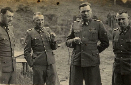 Left to right: Dr. Josef Mengele, Rudolf Höss, Josef Kramer, and an unidentified officer. Photo from United States Holocaust Memorial Museum #34755. See: German Medical Society Apologizes for Nazi-era Atrocities by Doctors